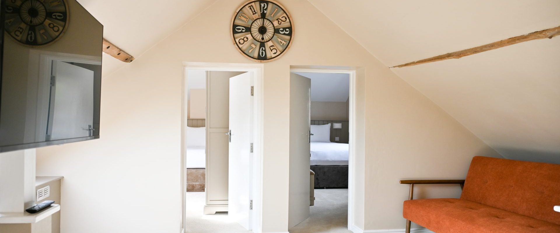 Discover our brand-new family suite nestled in the charming, rustic loft of the Coach House. This top-floor retreat features two adjacent double bedrooms, a spacious living area complete with a coffee and tea station, sofa bed, and its own private entrance. A bathroom is conveniently located downstairs. Elegantly designed, this inviting space comfortably accommodates up to six guests, offering the ideal setting for a cozy home away from home.